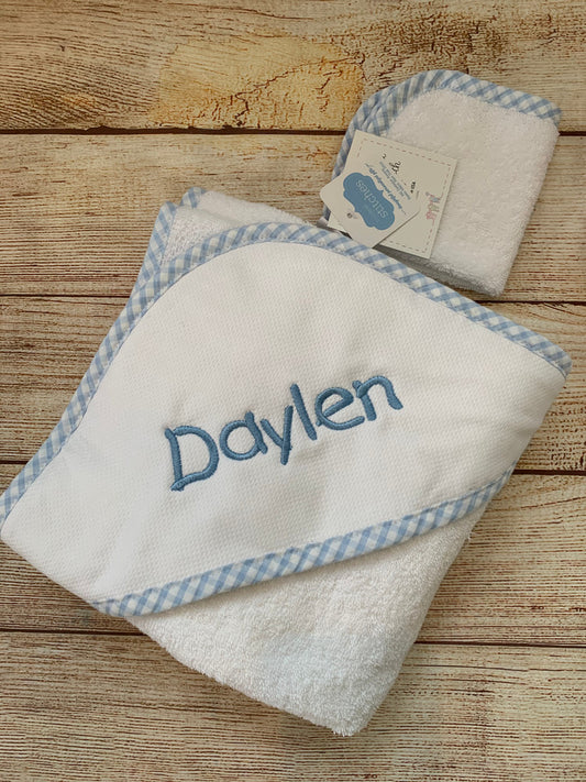 3 Marthas Small Blue Check Stripe Hooded Towel and Washcloth Set