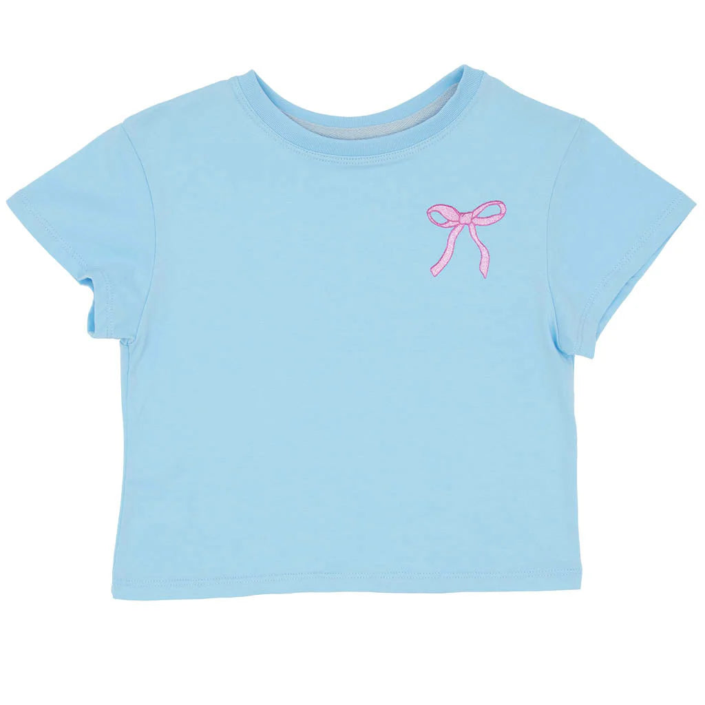 Pink Glitter Bowon light blue boxy TshirtThis Pink Glitter Bow Boxy T by Azarhia is perfect for adding some sparkle to your wardrobe. The light blue boxy T shirt features a pink glitter bow, adding a touch of glamour to any outfit. Made with high-quality materials, this T shirt is sure to make a statement and turn heads.